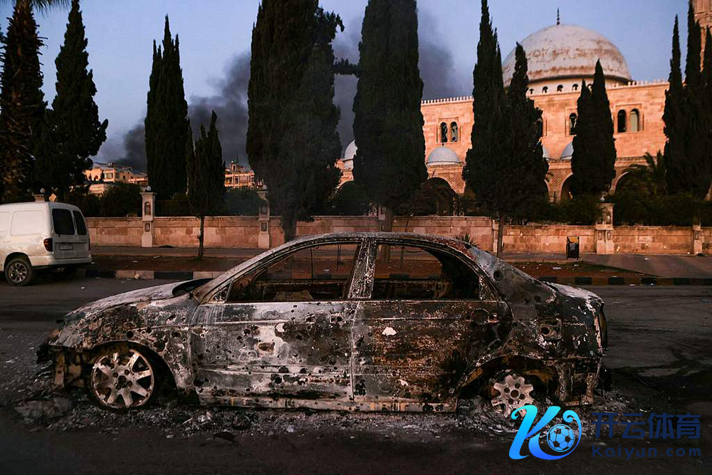 当地时辰2024年11月30日,叙利亚阿勒颇,叙利亚政府军与反政府武装捏续交火,街头被烧毁的汽车。视觉中国 图