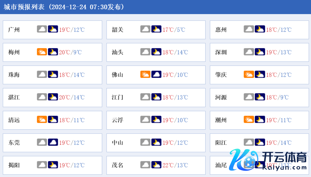 24日,广东大部市县多云到阴天,局部有稀罕小雨。最低气温:粤北市县4~7℃(部分市县有3~5℃的低温天气),南部市县11~15℃,其余市县8~11℃。