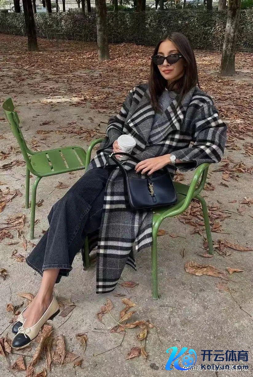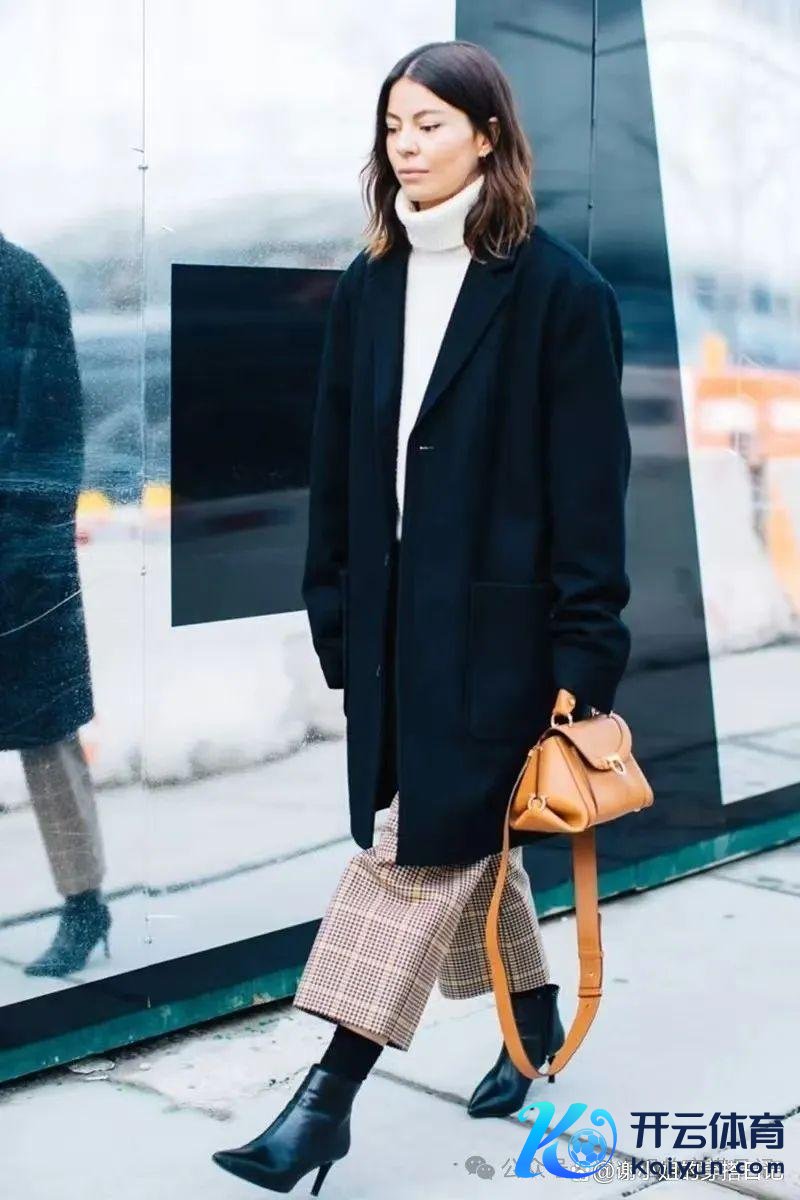 玄色大衣的勤俭与格纹阔腿裤的复杂图案酿成了剖析的对比,