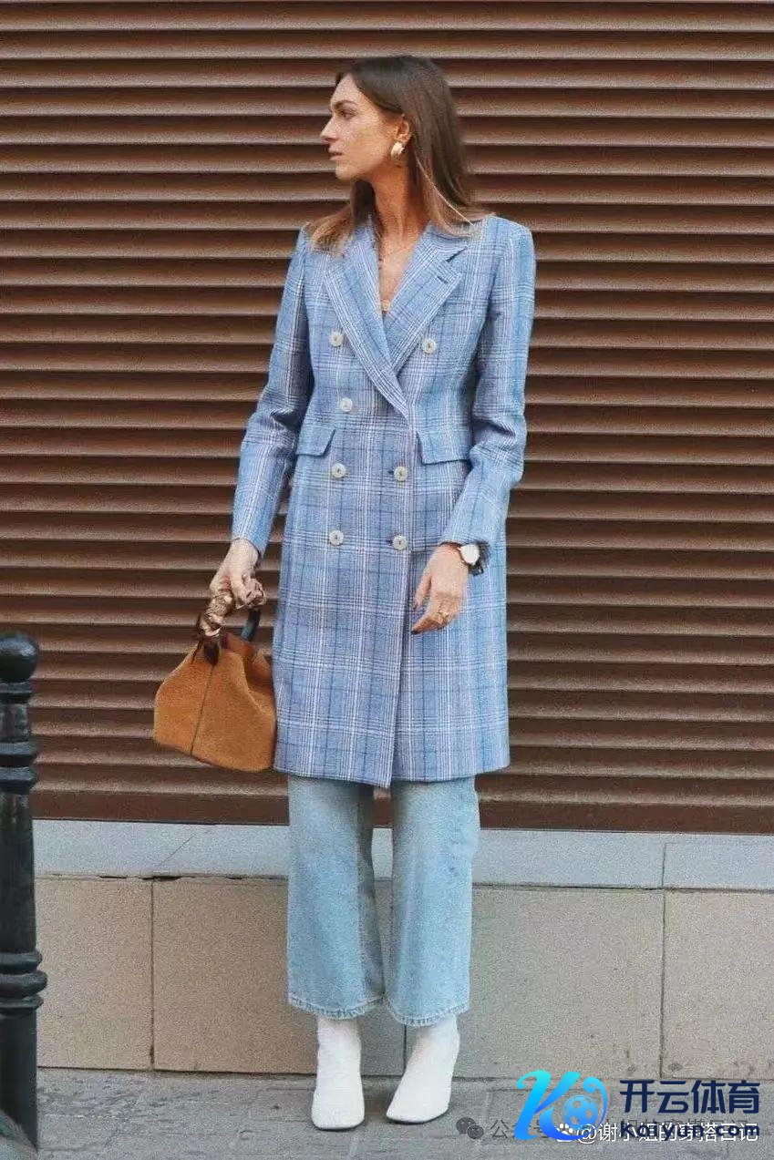 牛仔裤的即兴与格纹大衣的隆重相互衬托,