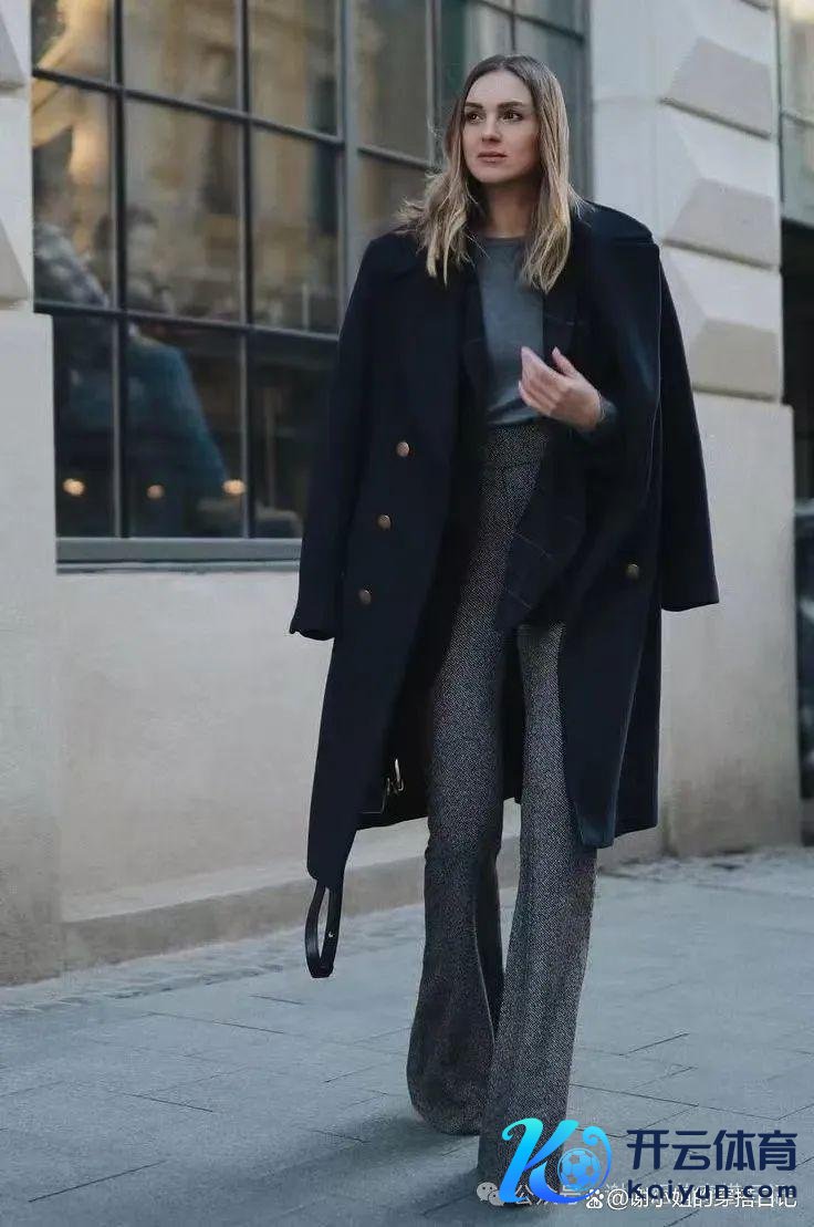玄色大衣的修身服从搭配微喇裤的修长,